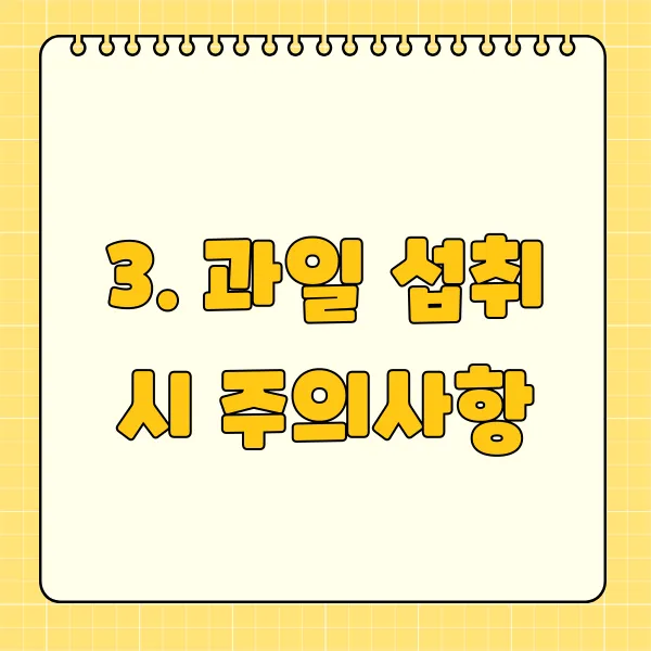 적당한 양 섭취 : 과일은 두 번 정도 일정량을 나누어 섭취하는 것이 좋습니다. 과일 한 개나 3/4컵에서 1컵 가량이 적당합니다.